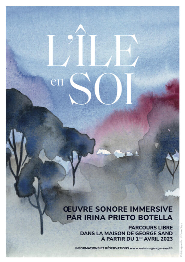 Maison George Sand (Nohant-Vic), Mars 2023"L’île en soi" est une œuvre conçue pour être écoutée lors d’une déambulation libre dans la Maison de George Sand. Les sons qui constituent l'œuvre, diffusés en son binaural à travers des casques sans fil, évoluent en fonction des déplacements des individus dans les différentes pièces de la maison.L'œuvre est articulée autour d’un dialogue entre George Sand (construit à partir d’extraits de ses textes et interprété par Marie-Christine Barrault) et l'artiste Irina Prieto Botella. Les deux femmes évoquent leurs séjours à Majorque et s’interrogent sur le pourquoi de nos voyages. Elles nous invitent à questionner la notion d’espace intérieur et extérieur, d’isolement et de connexion aux autres.Ces réflexions sont accompagnées de sons de Majorque enregistrés par Irina Prieto Botella, dans les endroits où Sand a séjourné en 1838, ainsi que des sons de la Maison de George Sand et ses environs.